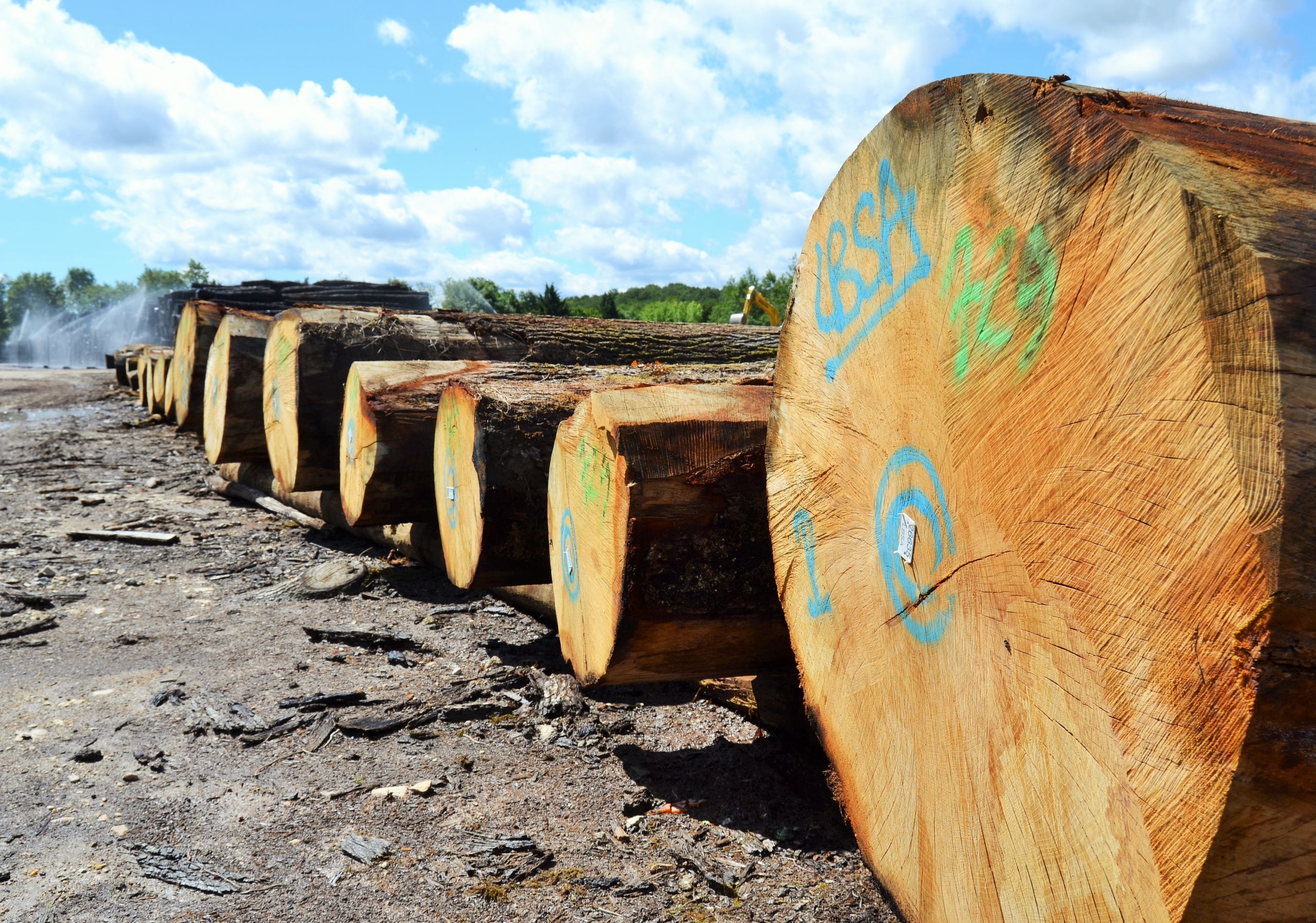 Pour éviter qu’il ne se détériore en forêt, un stock de bois conséquent est entreposé sur les 17 ha de la scierie LBSA. Des jets d’eaux humidifient la matière première, pour éviter que le bois ne se fasse manger par les insectes. Certaines piles vont être conservées trois mois avant d’être travaillées.