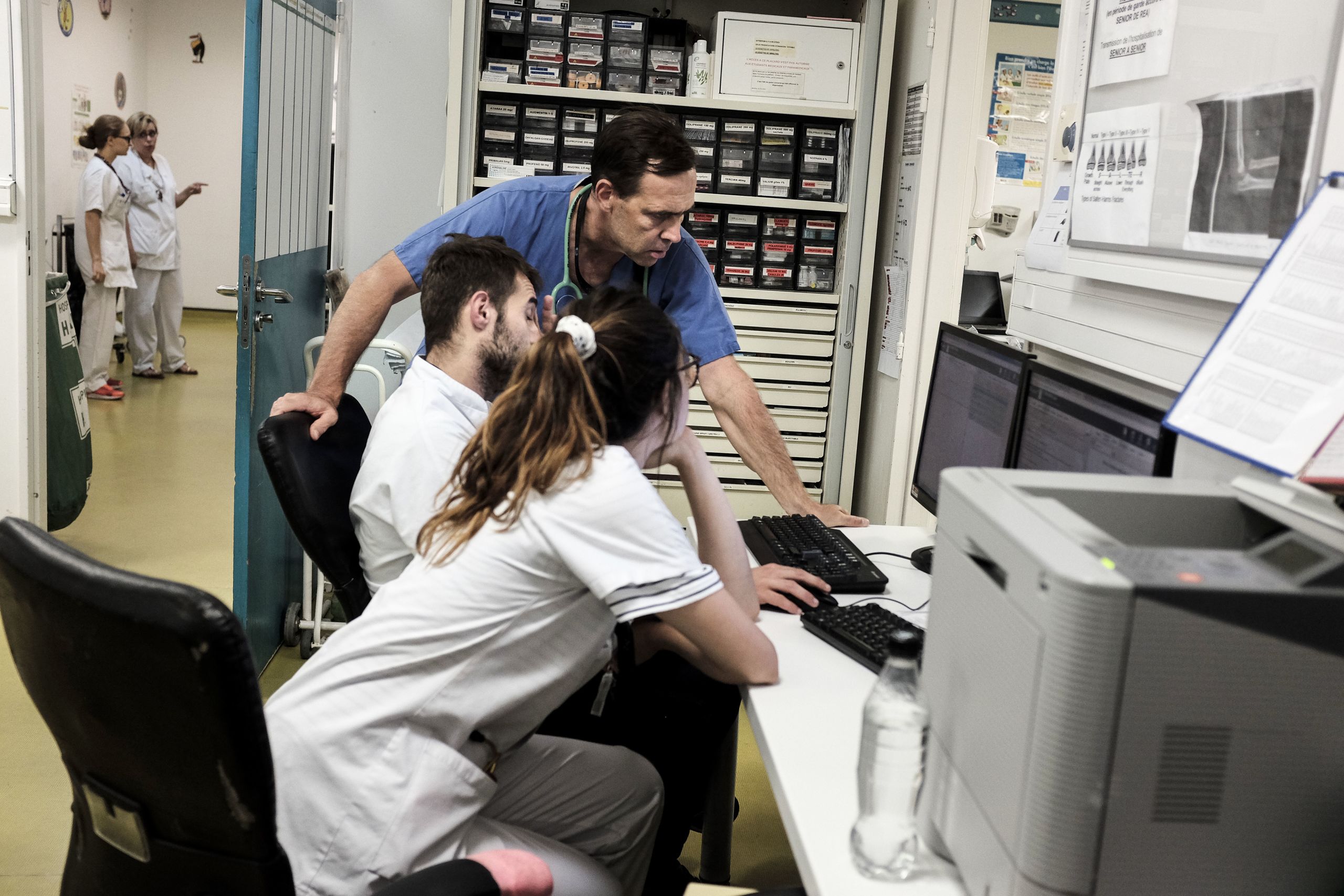 Le centre névralgique des UV se situe derrière la banque d’accueil. Dans cette salle, médecins seniors, internes et externes se relaient derrière quatre ordinateurs où s’affichent les noms des patients associés à une couleur selon le degré d’urgence (lire partie III).