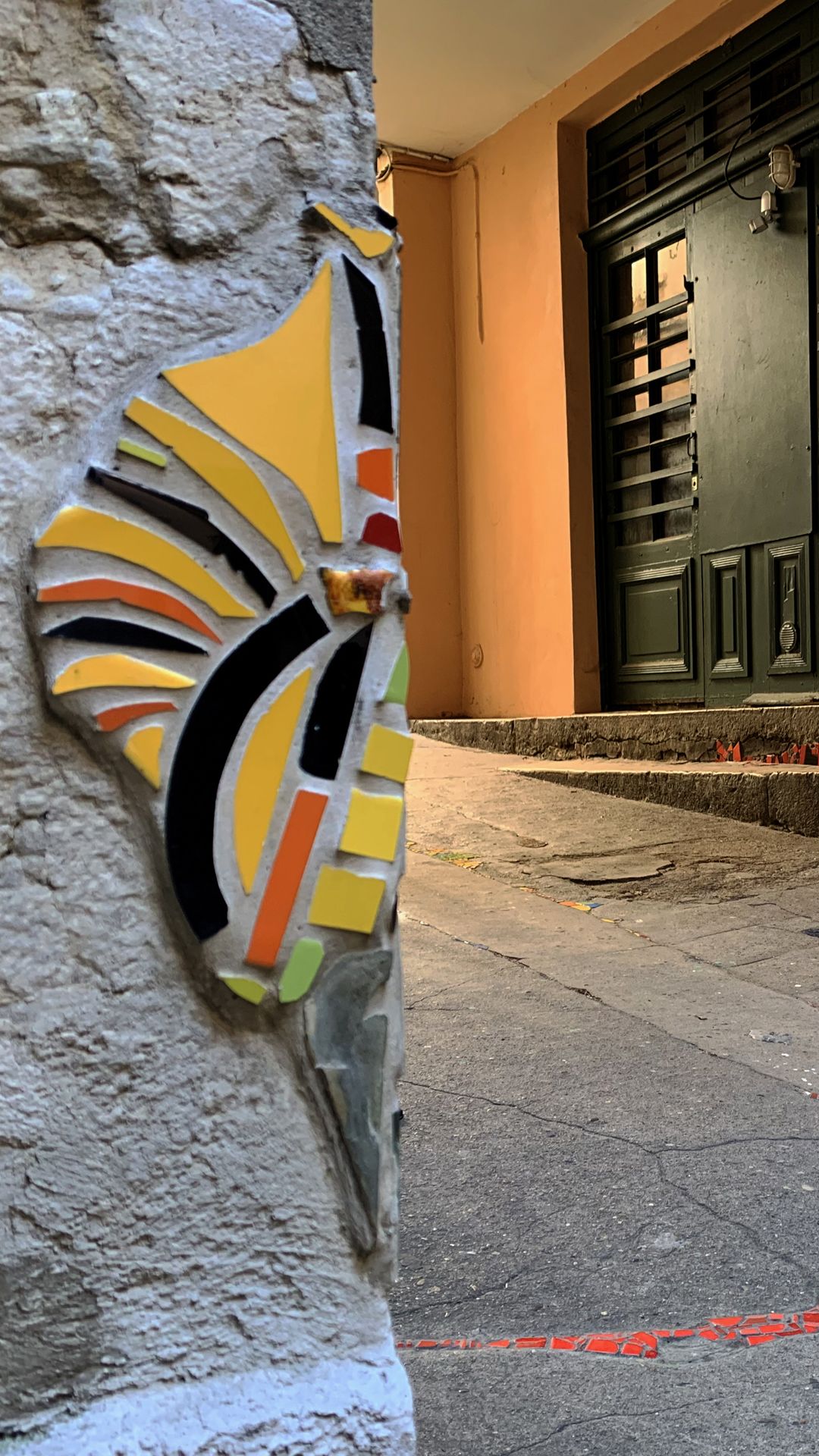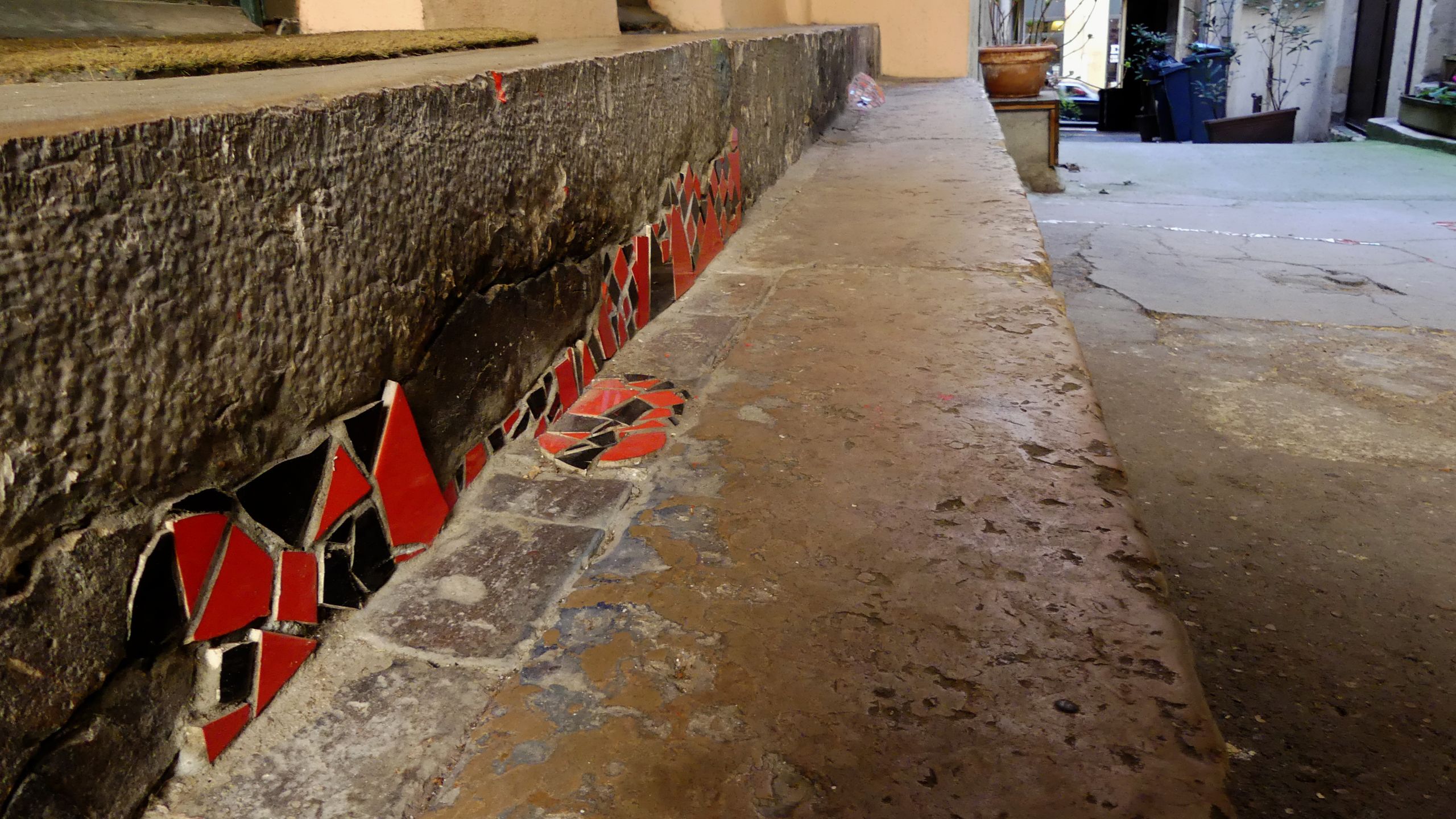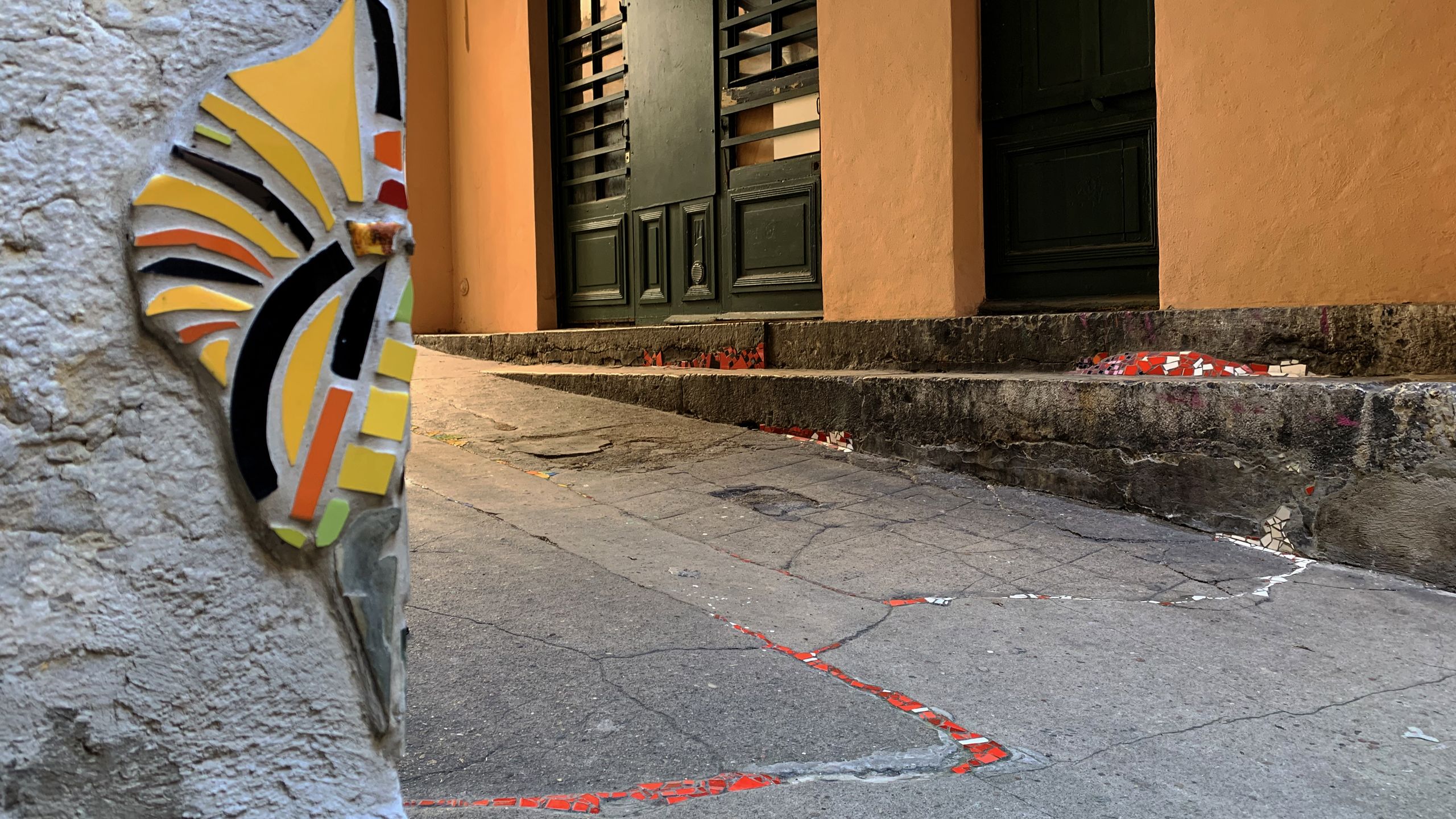C’est sur le plateau de la Croix-Rousse que l’on trouve ses premiers jets de carrelage. Et dans la cour du Complexe du rire, sur les pentes, là où celui qui travaillait déjà la mosaïque et la céramique avait son atelier.