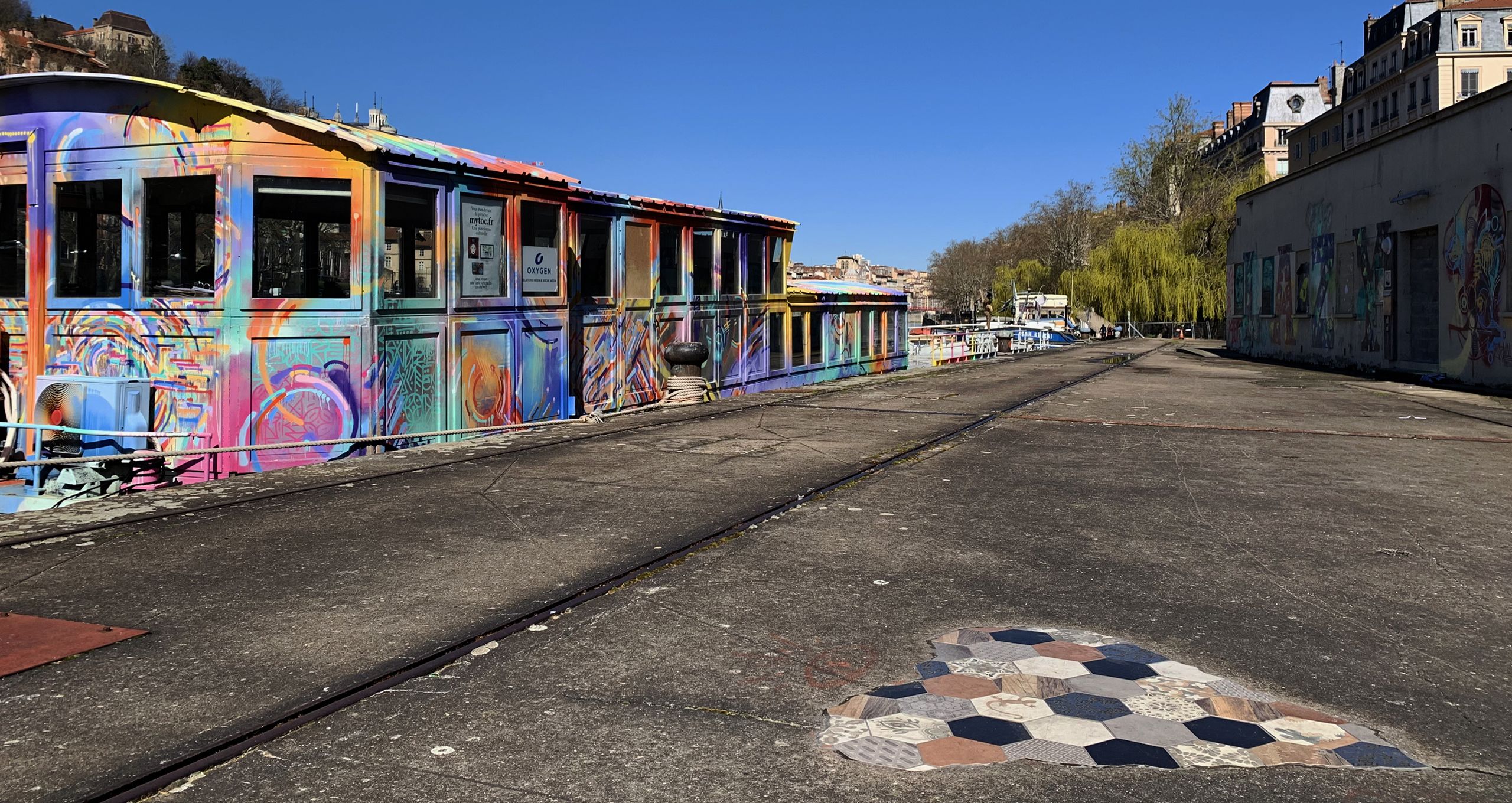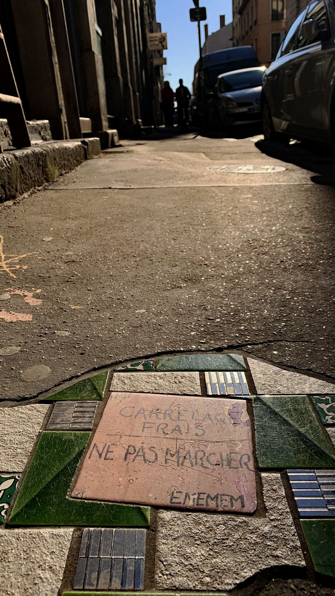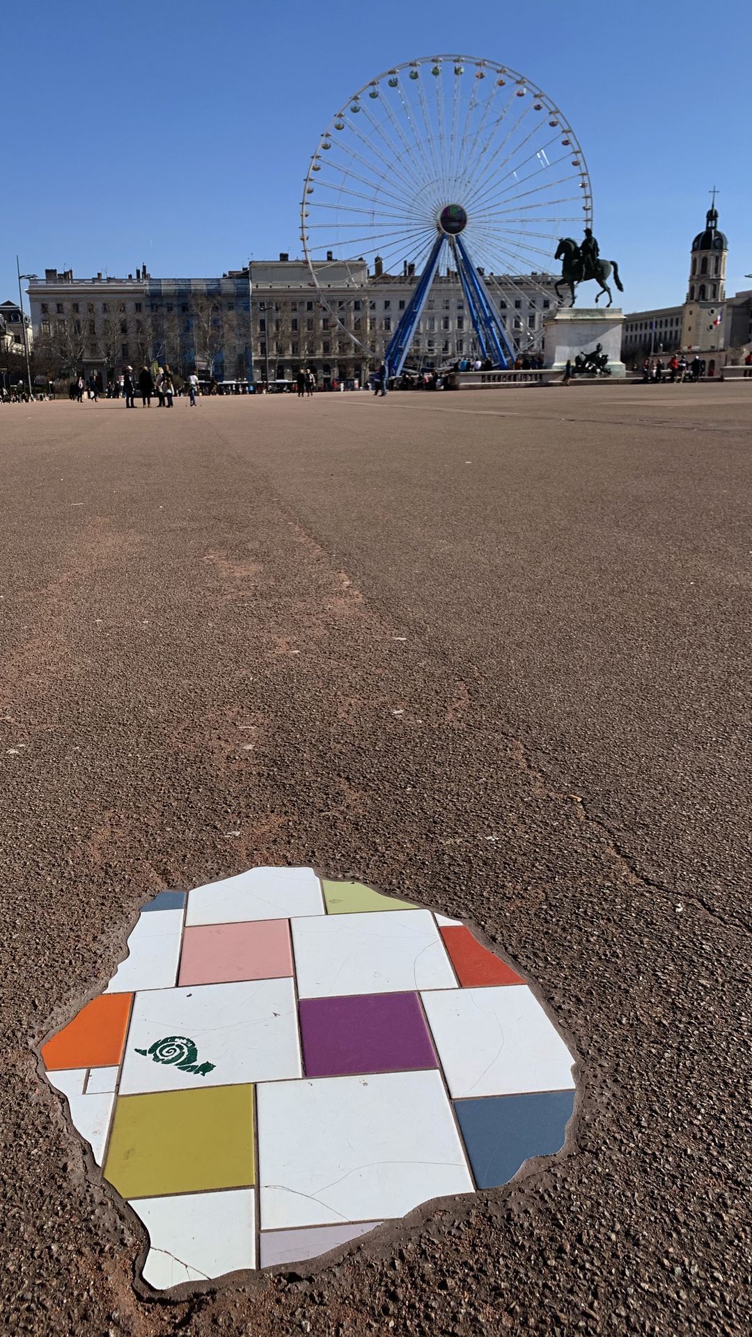 On y trouve désormais de nombreuses œuvres signées Ememem, et Skéné, l’autre as lyonnais de la mosaïque, y a déposé ses cœurs. Et si nous emboîtions le pas de ces artistes du bitume dont le travail interpelle les passants amenés à piétiner ces flaques colorées ?