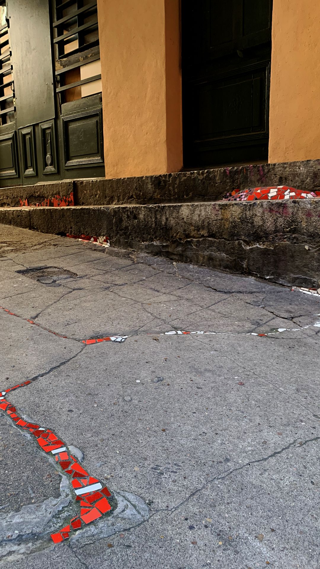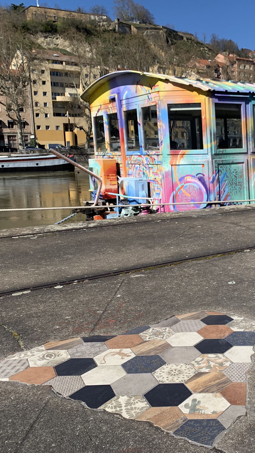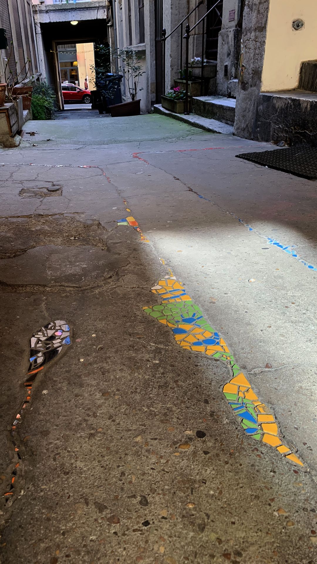 On y trouve désormais de nombreuses œuvres signées Ememem, et Skéné, l’autre as lyonnais de la mosaïque, y a déposé ses cœurs. Et si nous emboîtions le pas de ces artistes du bitume dont le travail interpelle les passants amenés à piétiner ces flaques colorées ?