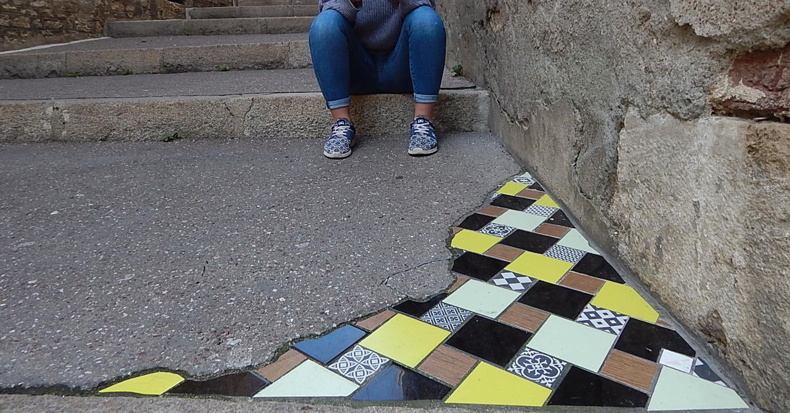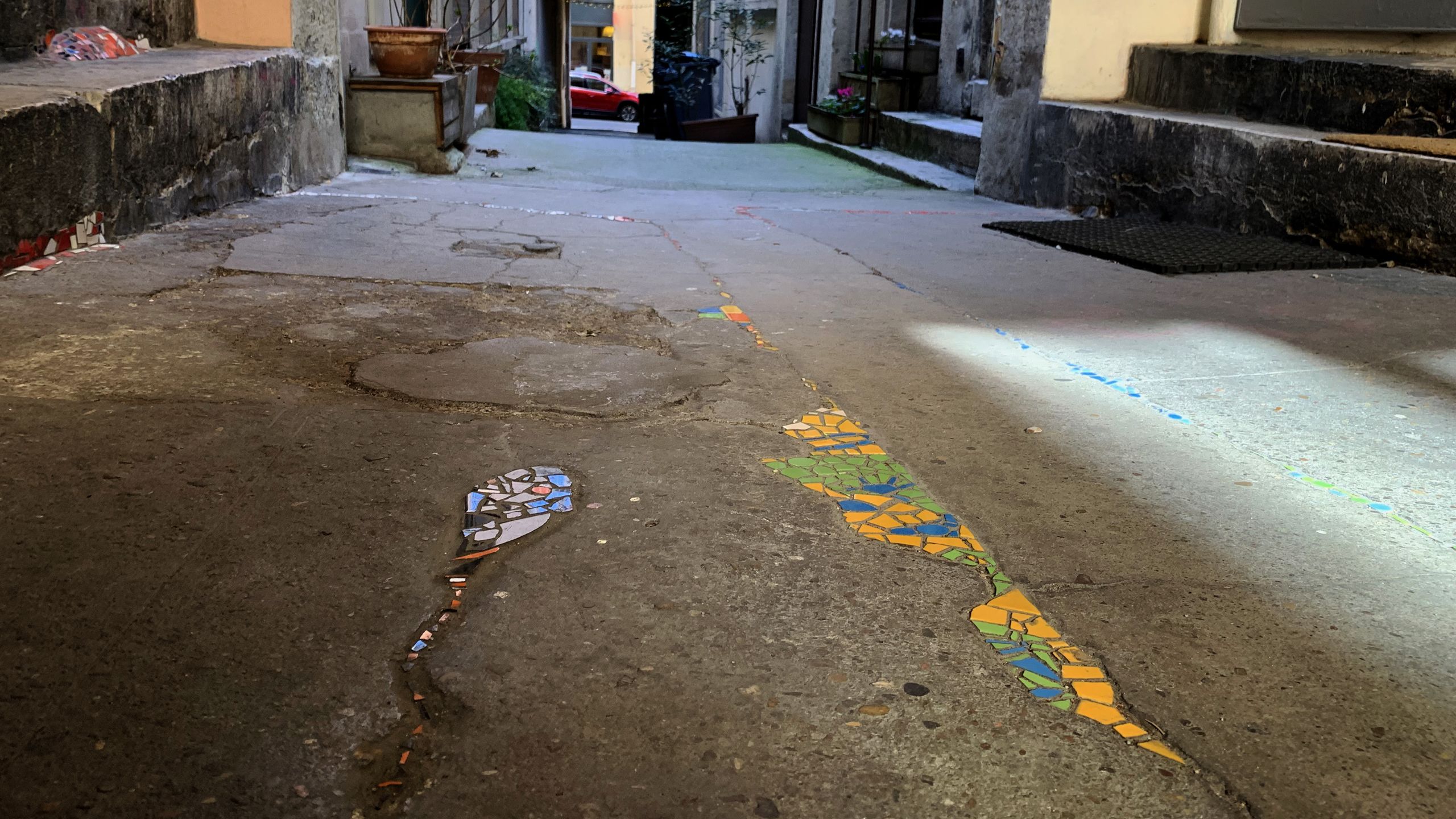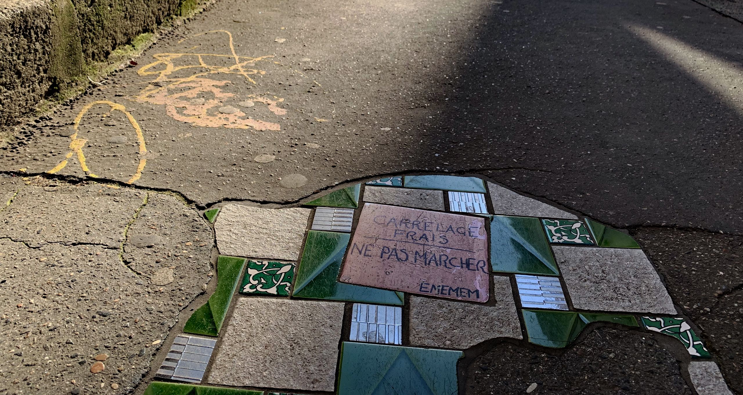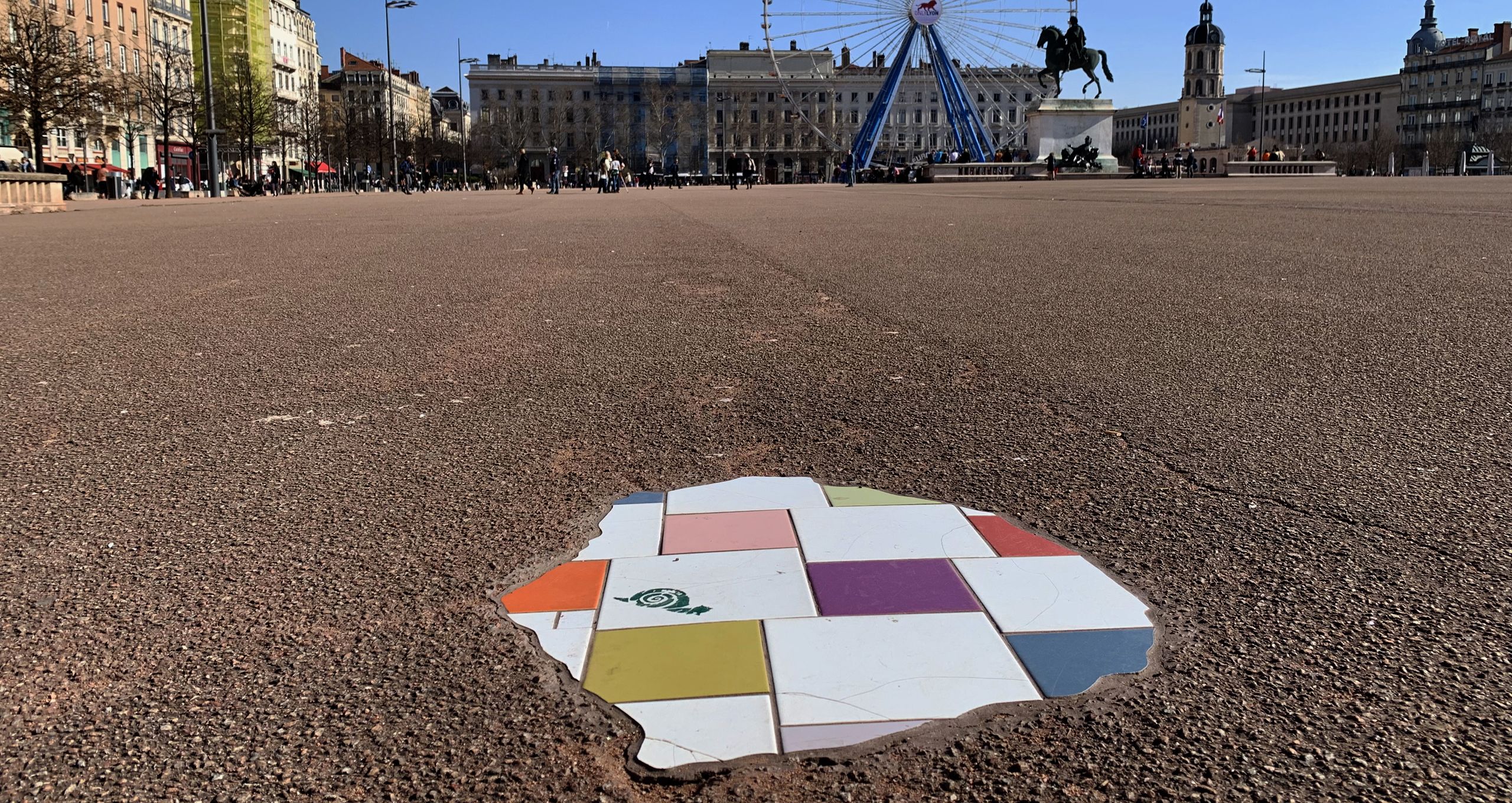 Jusqu'à présent bien accrochée aux murs, la céramique s’allonge désormais également sur nos trottoirs. Soigner les plaies du bitume avec des pansements en mosaïque qui colorent la ville et l’embellissent, c’est devenu l’obsession du street artiste lyonnais Ememem. Le créateur de ces flaques de carrelage a même, il y a trois ans, donné un nom à ce travail : le flacking.